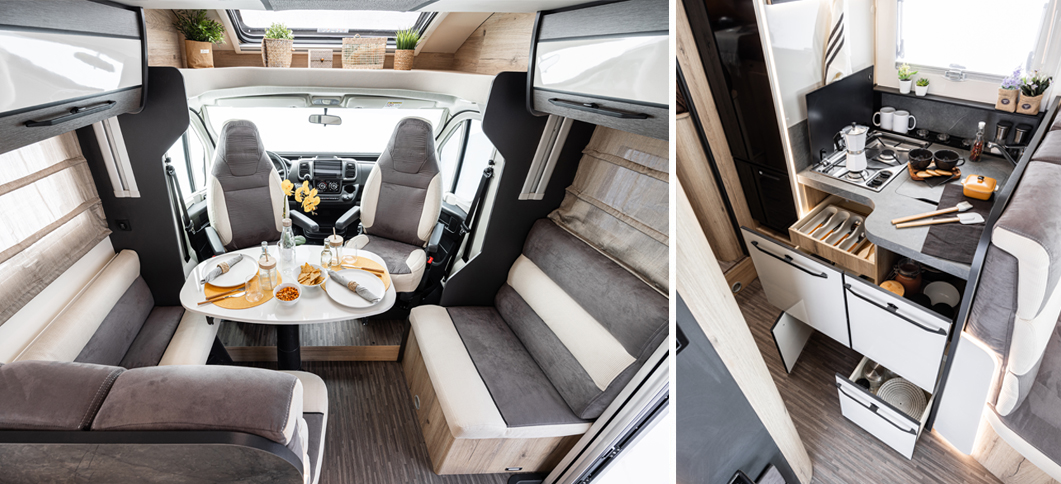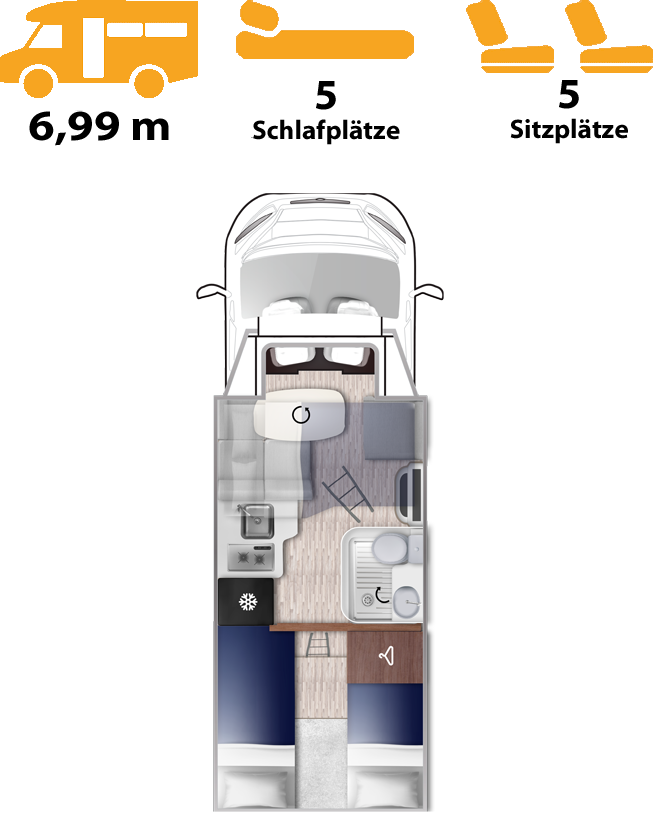 Der Miller Kansas, mit komfortablen Einzelbetten im Heck und im Font ein Hubbett, kommt mit einer Länge von 6,99 m daher. Die moderne Küchenzeile, mit großem Kühlschrank, lässt keine Wünsche offen. Das Panoramdach Open Sky, eine Doppeldinette, das Bad mit Dusche, viele Detailösungen und ausreichender Stauraum zeichnen das Reisemobil kansas aus.